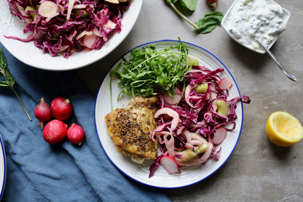 This balanced meal brings a little protein from the chicken, creamy fats from the mint yogurt dip, and a healthy serving of low-carb veggies packed with flavor and that satisfying crunch we so often miss. You'll also get a little extra crunch from the herby crisp chicken skin!