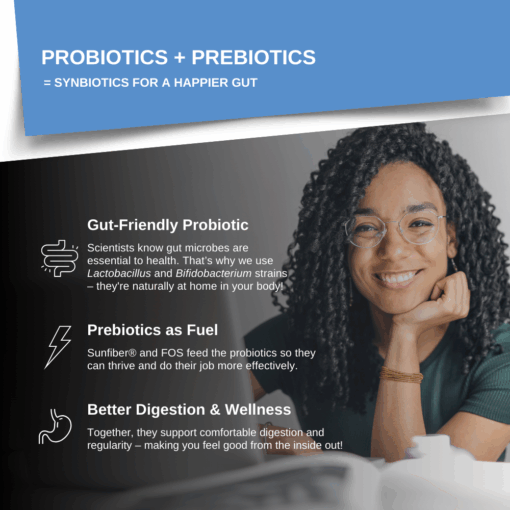 Each probiotic capsule contains 2 types of prebiotics – Sunfiber® and FOS.