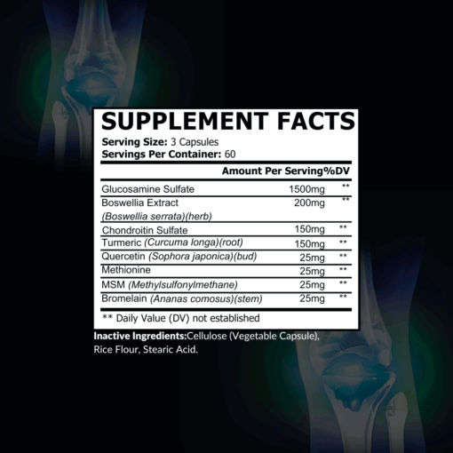 Ingredients per serving: 1500mg Glucosamine Sulphate (with 1050mg base glucosamine), 200mg Boswellia Extract, 150mg Chondroitin Sulphate, 150mg Turmeric Root (Curcuma Longa), 25mg Quercetin, 25mg MSM (Methylsulfonylmethane), 25mg Methionine, 25mg Bromelain