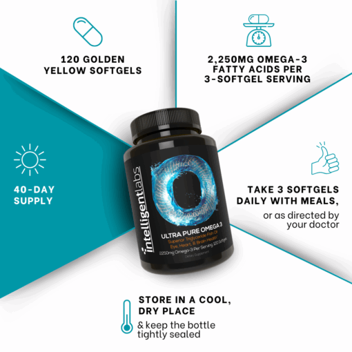 A serving of our Ultra Pure Omega-3 supplement gives you 1,224mg EPA, 816mg DHA, and 210mg other TG fatty acids for a total of 2,250mg of the highest quality fish oil!
