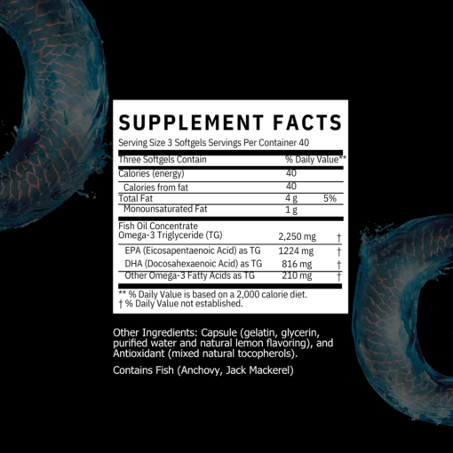 Ingredients per serving: 2250mg Fish Oil Omega-3 Triglyceride (TG), 1224mg EPA (Eicosapentaenoic Acid) as TG, 816mg DHA (Docosahexaenoic Acid) as TG, 210mg Other Omega-3 Fatty Acids as TG.
